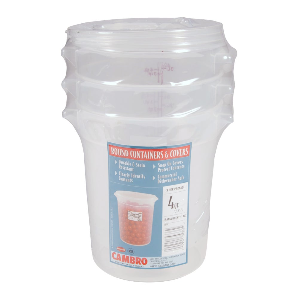 Contenedor de alimentos redondo de 4 cuartos, translúcido, polipropileno, con tapa, 3 Cdd Paq, 1/Caj