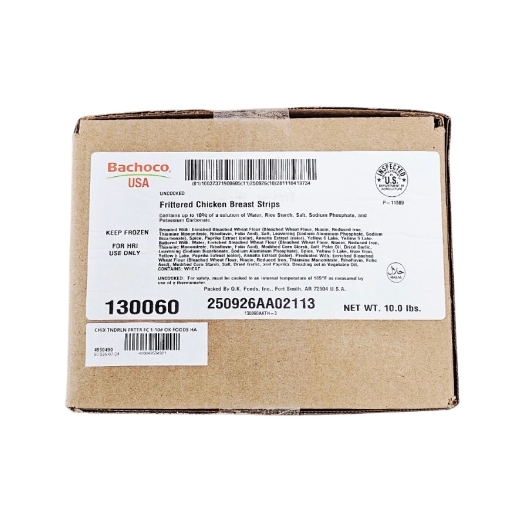 Trocitos de pollo empanados y fritos, cocidos y congelados