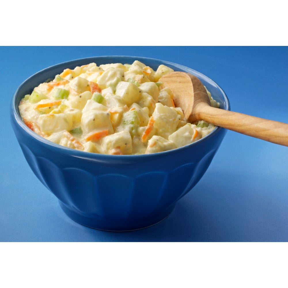 Esta ensalada combina ingredientes caseros, como papas frescas, huevos en cubitos, cebollas y zanahorias ralladas, y luego los combina en un aderezo dulce para crear una alternativa conveniente a las ensaladas de papas caseras.