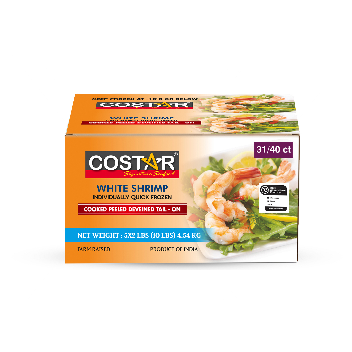 Camarones blancos, pelados y desvenados con cola, 31-40 unidades por libra, cocidos, IQF, bolsa de 2 libras, 5/Caj