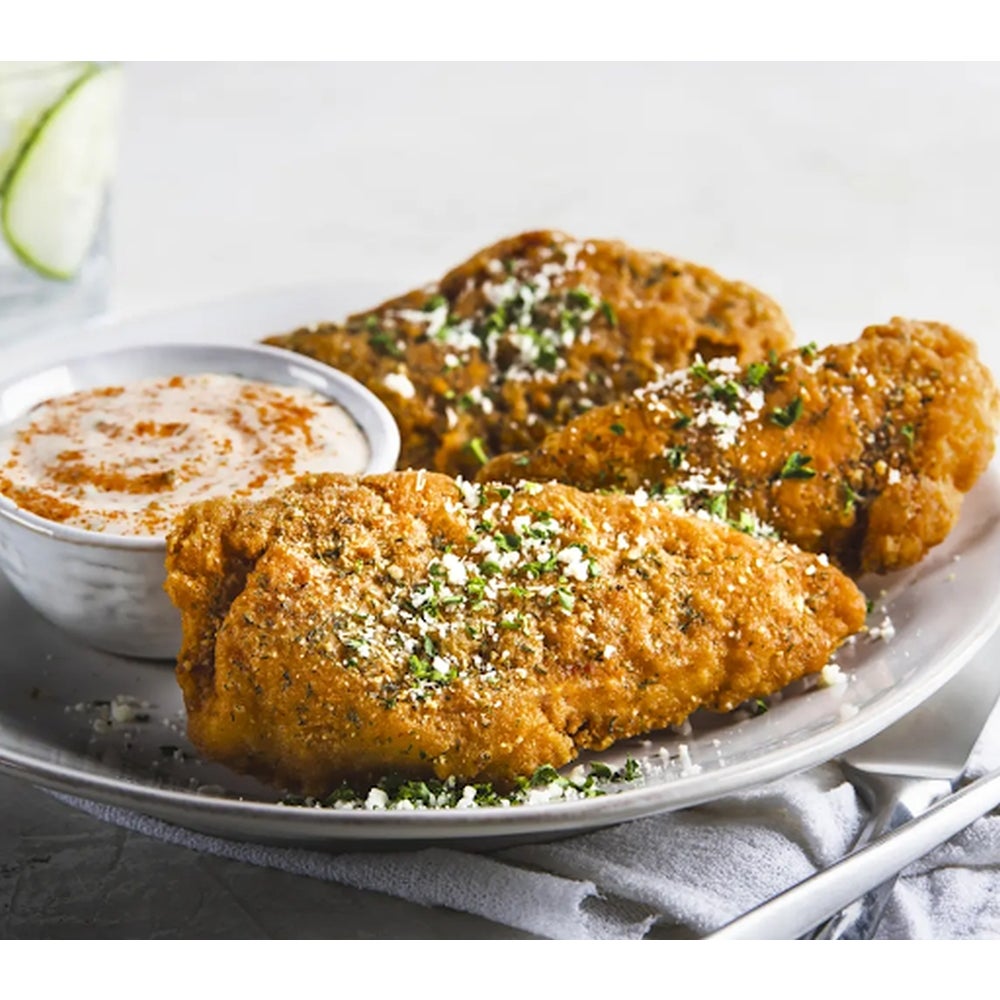 Tiras de pechuga de pollo empanizadas fritas tradicionales, congeladas, 1 onza