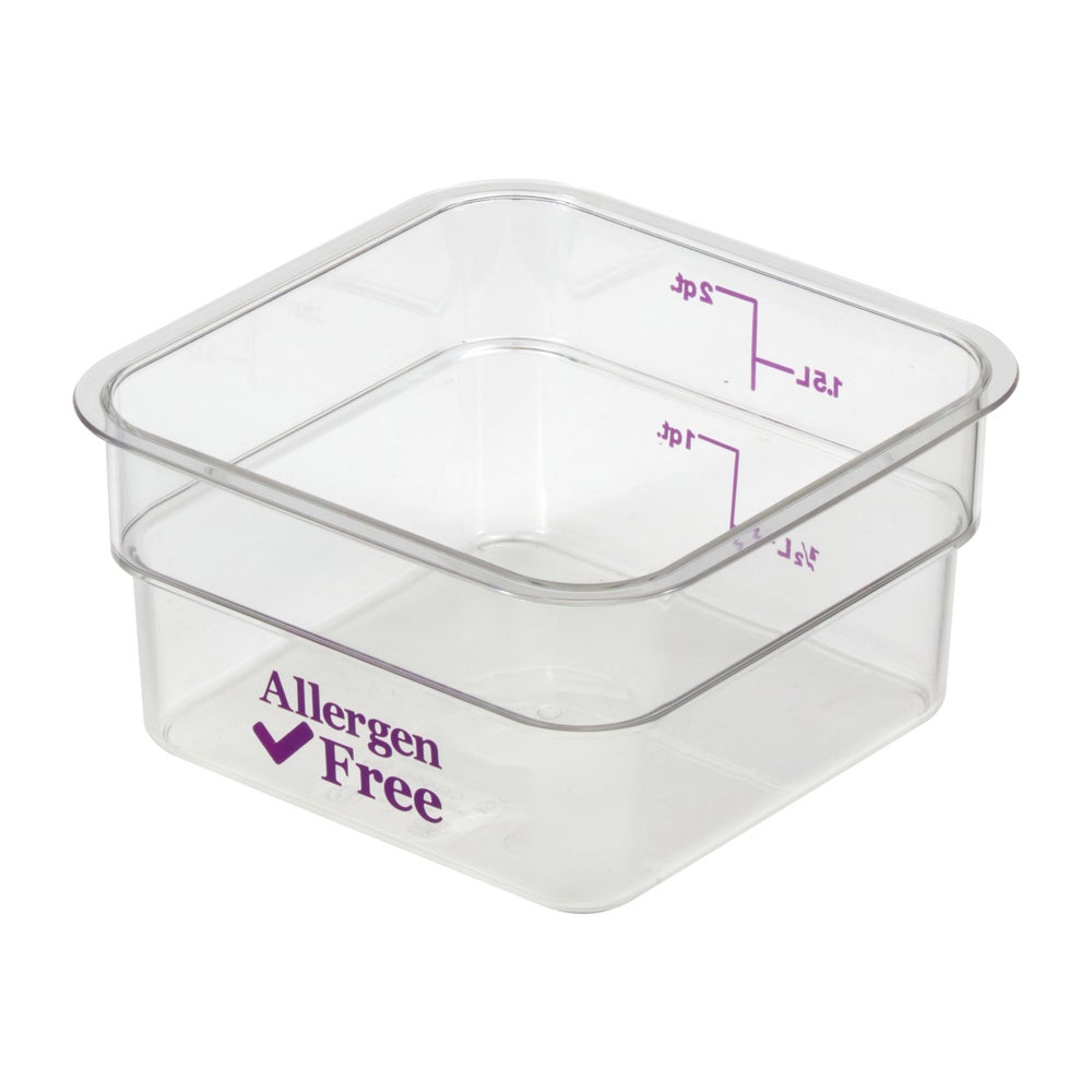 Este recipiente de almacenamiento de dos cuartos está adornado con el logotipo morado de Cambro para productos sin alérgenos y tiene marcas de graduación moradas. Ofrece una solución para la repostería sin gluten o en cocinas donde evitar la contaminación cruzada es una prioridad.
