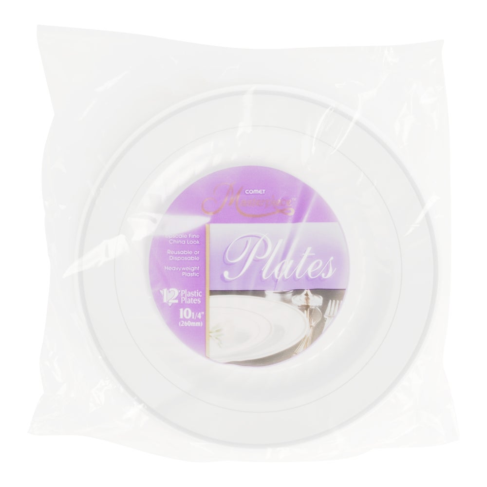Platos de plástico de 10,25 pulgadas, blancos con ribete plateado, poliestireno