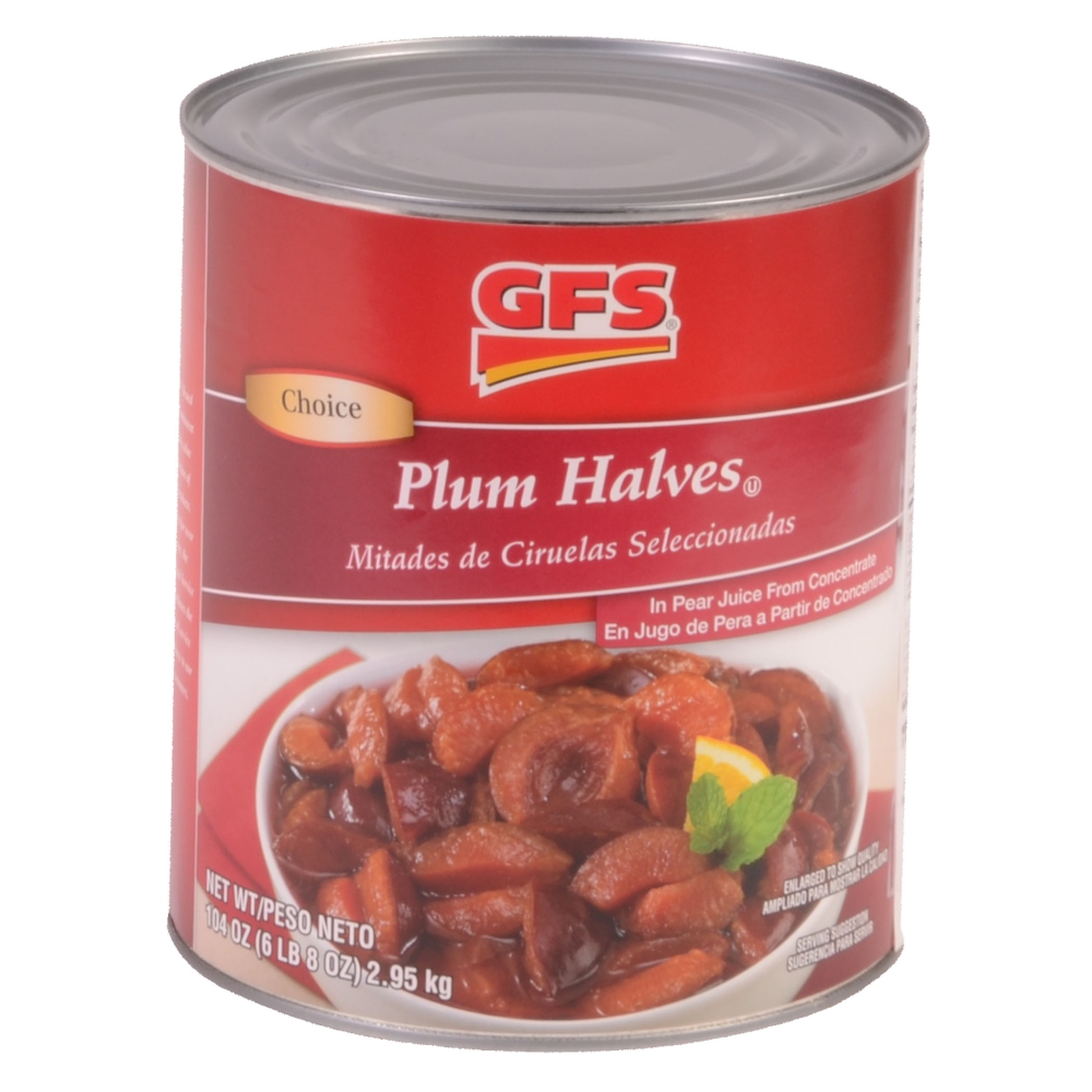 Ciruelas, cortadas por la mitad, en zumo, Choice, #10, lata de 106 oz
