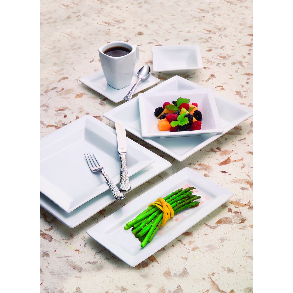 Estos platos rectangulares tienen un color blanco ultra brillante y limpio y están completamente vitrificados. Son ideales para presentaciones modulares o para compartir aperitivos y postres.