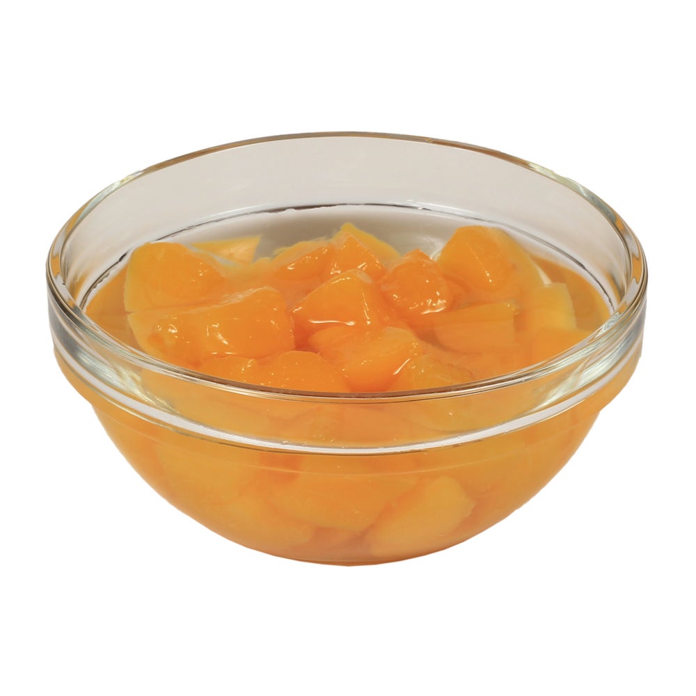 Estos duraznos enlatados en cubitos se conservan en almíbar ligero y son adecuados como opción de postre en escuelas o en entornos sanitarios.