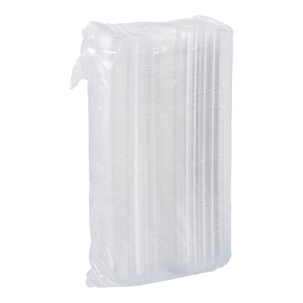 Este envase de plástico para postres cuenta con una tapa abisagrada y es transparente para facilitar la visibilidad del contenido.
