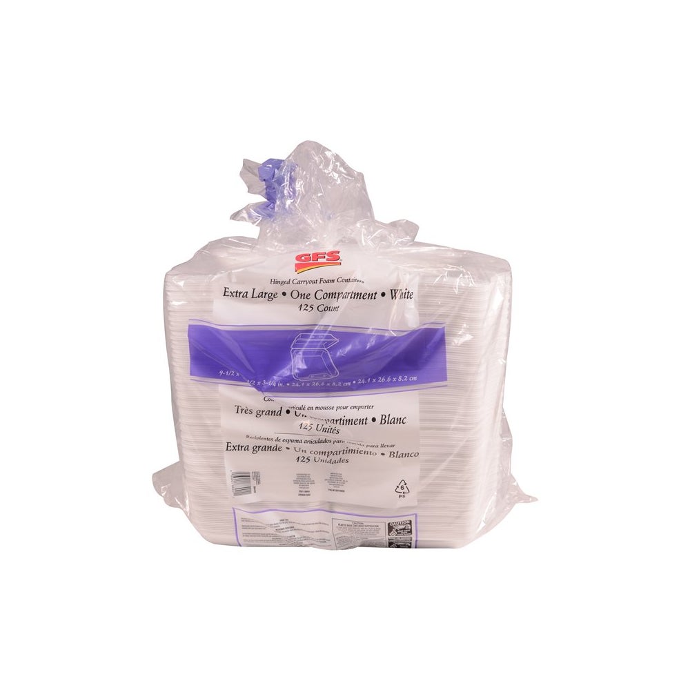 Contenedores de espuma de un compartimento extragrandes de 9,5 x 10,5 x 3,25 pulgadas, blanco, con bisagras, poliestireno, 125 Cdd Paq, 2/Caj